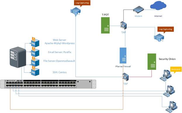 Figure 2 demonstrates the network structure of CIC-honeynet and installed security tools. There are two TAPs for capturing network activities. Outside the firewall, there is T-POT which captures the users’ activities through external-TAP. Behind the pfsense firewall in the internal network Security Onion has been used to analyse the captured data through internal-TAP. It is a Linux distro for intrusion detection, network security monitoring, and log management. It’s based on Ubuntu and contains Snort, Suricata, Bro, OSSEC, Sguil, Squert, ELSA, Xplico, NetworkMiner, and other security tools.