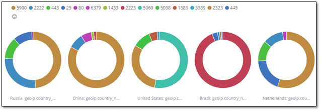 In figure3, top 5 of countries are demonstrated by related ports. For example the attacks from Russia have been 48.49% through port 5900, 27.35% through port 2222, 12.59% through port 443, 10.86% through port 25 and 0.71% through port 80.